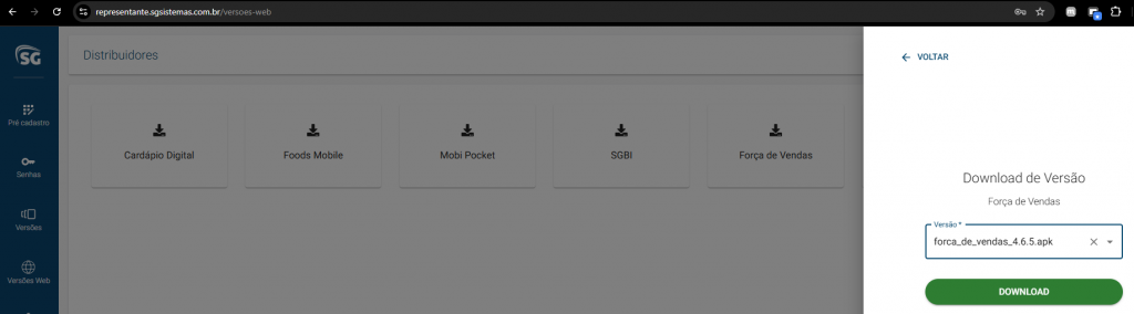 O aplicativo pode ser baixado através do acesso a portal de distribuidores, opção Versões Web > Força de Vendas.