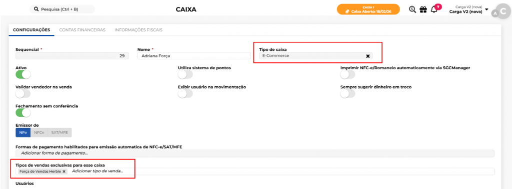 • Abrir um caixa com tipo de caixa: E-Commerce. E tipos de vendas exclusivas para esse caixa: Força de vendas herbie.