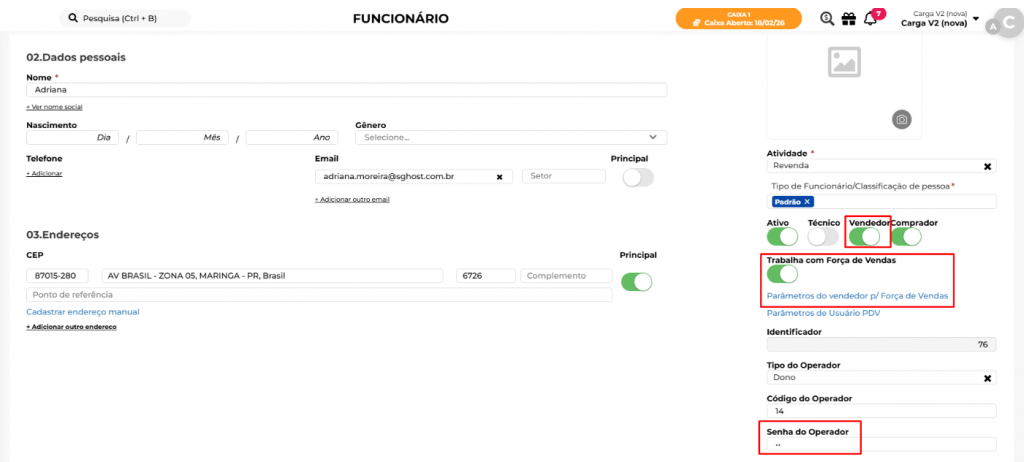 Após configurar o caixa, configurar o cadastro do funcionário no caminho Loja> Cadastros> Funcionários.