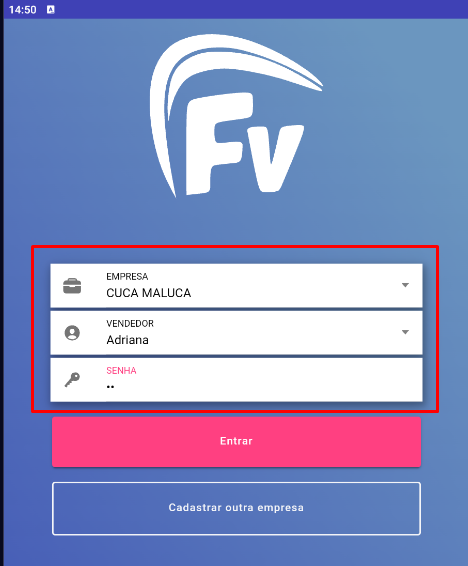 No APP, clicar na opção “Trocar de empresa” e incluir a empresa, vendedor e a senha configurado no campo senha do operador.