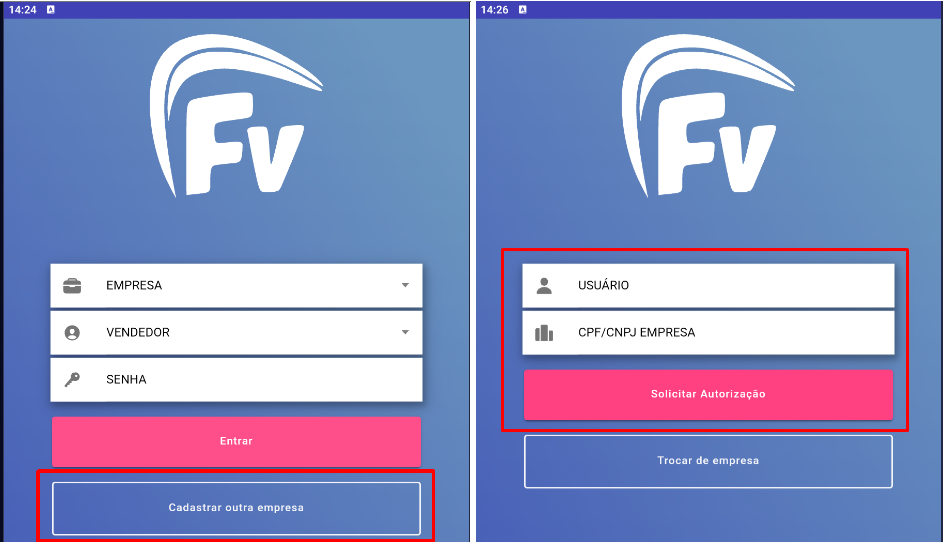 Após a instação do do aplicativo, no primeiro acesso deve-se acessar a opção “Cadastrar outra empresa”, informar o usuário (vendedor) e o CNPJ da empresa e solicitar a autorização de uso na opção “Solicitar Autorização”.