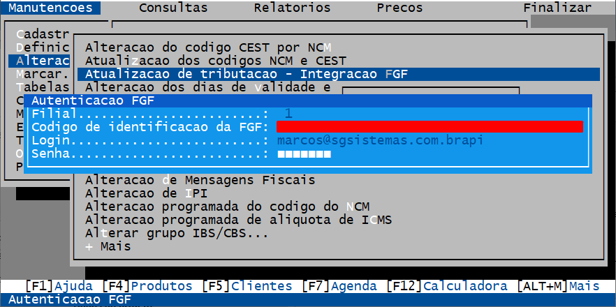 Produtos e Precos > Cadastro de Produtos > Manutencoes > Alteracoes diversas… > Outras Alteracoes > Atualizacao de tributacao – Integracao FGF > Autenticacao