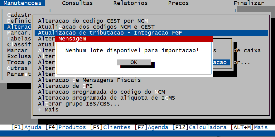 Será realizada a verificação de lotes para importação. Caso haja lotes disponiveis, será realizado o processo de importação e atualização das tributações dos produtos. Caso não haja, será apresentada a mensagem “Nenhum lote disponivel para importacao!” e processo será finalizado.